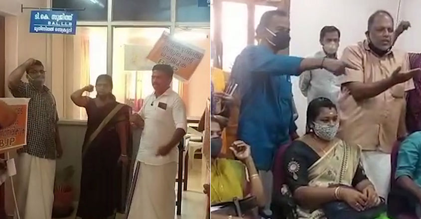 കോണ്‍ഗ്രസ് അനുഭാവിയായ നഗരസഭാ ജീവനക്കാരനെ ഫെയ്സ്ബുക് പോസ്റ്റിന്‍റെ പേരില്‍ കഴിഞ്ഞ സി.പി.എം. ഭരണസമിതി സ്ഥലംമാറ്റിയിരുന്നു. ഇപ്പോഴത്തെ സി.പി.എം. ഭരണസമിതി നഗരസഭ സെക്രട്ടറിെയ സംരക്ഷിക്കുന്ന നിലപാടാണ് സ്വീകരിച്ചതെന്ന് കോണ്‍ഗ്രസും ബി.ജെ.പിയും ആരോപിച്ചു. സെക്രട്ടറിയെ സ്ഥലംമാറ്റുന്നതു വരെ പ്രക്ഷോഭം തുടരാനാണ് പ്രതിപക്ഷ പാര്‍ട്ടികളുടെ തീരുമാനം.