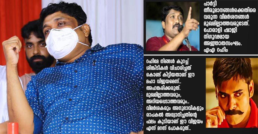 വല്ലാതെ അഹങ്കരിക്കരുത് റഹിമേ..പാർട്ടിക്ക് വേണ്ടി എന്നും ഓശാന പാടാൻ ലക്ഷങ്ങൾ കൊടുത്ത് സോഷ്യൽ മീഡിയയിൽ നിർത്തിയേക്കുന്നവരിൽ ഞാനില്ല..ഞാനെന്നല്ല ഇവിടത്തെ ലക്ഷക്കണക്കിന് സാധാരണ അനുഭാവികളുമില്ല..ഇടത് മുന്നണി ഇപ്രാവശ്യം മഹത്തായ വിജയം നേടിയിട്ടുണ്ടെങ്കിൽ അതിന് പിന്നിൽ മുഖമില്ലാത്ത,, അറിയപ്പെടാൻ താത്പര്യമില്ലാത്ത,പാർട്ടി ആഞ്ജക്കായി കാത്ത് നിൽക്കാതെ സ്വന്തം സമയവും ജോലിയും മിനക്കെട്ട് ആശയങ്ങളും വികസന വാർത്തകളും പ്രചരിപ്പിക്കുന്ന,, പാർട്ടി പറയുന്നതിന് മുൻപേ ശത്രുക്കൾക്ക് മുൻപിൽ പ്രതിരോധം തീർക്കുന്ന പതിനായിരക്കണക്കിന് മനുഷ്യരുടെ അധ്വാനമുണ്ട്..അവരാണ് ഈ വിജയത്തിന് പിന്നിൽ..