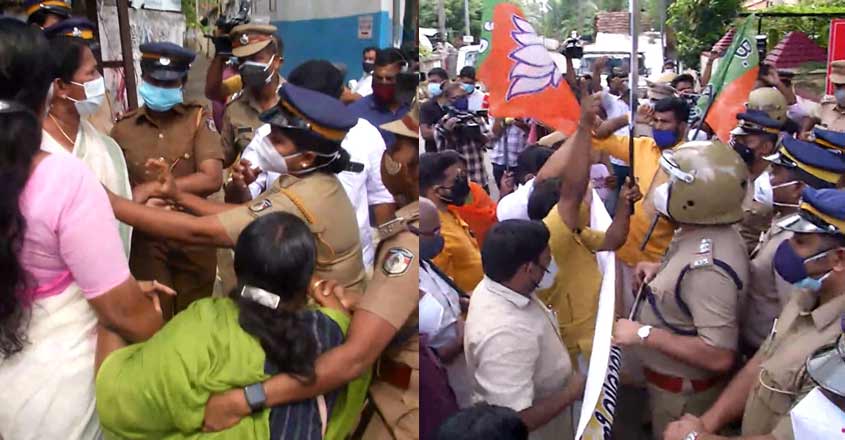 ഏ.കെ.ജി സെന്ററിൽ സി.പി.എം സംസ്ഥാന സെക്രട്ടേറിയറ്റ് ജോസഫൈന്റെ വിവാദ പരാമർശം ചർച്ച ചെയ്യുമ്പോൾ പുറത്ത് തെരുവിൽ പ്രതിപക്ഷം വലിയ പ്രതിഷേധമാണ് ഉയർത്തിയത്.
