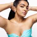ഇളംനീല നിറത്തിലുള്ള സ്ട്രാപ്പ്ലെസ് ഫ്രോക്കാണ് താരം ധരിച്ചിരിക്കുന്നത്